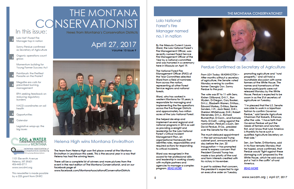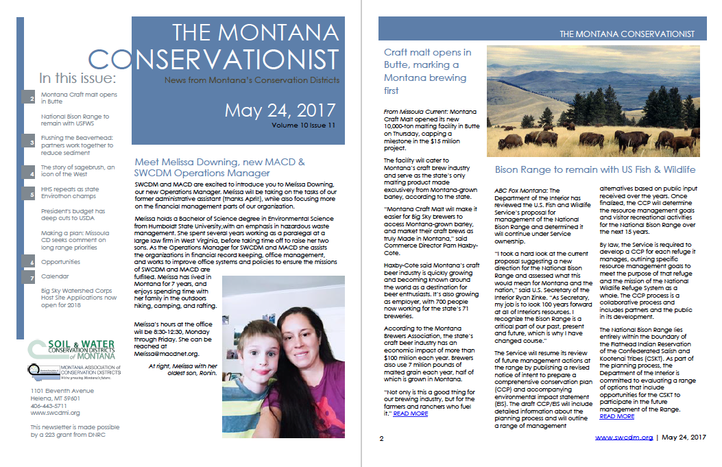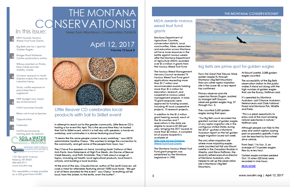 The Green Mountain Conservation District held a regular meeting on April 19 at 7:00 pm. Reports from the GMCD Administrator, Montana Fish, Wildlife, and Parks, and the Natural Resource Conservation Service. See attached minutes for more information. Ten 310 applications/projects were discussed. 04.19.17…